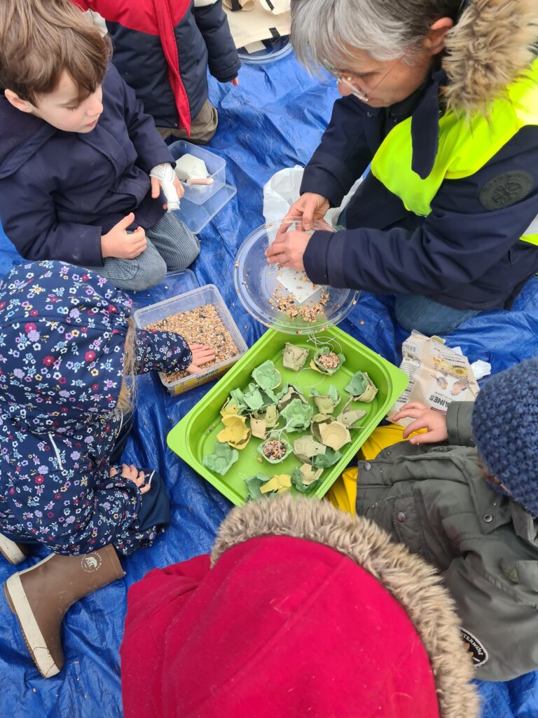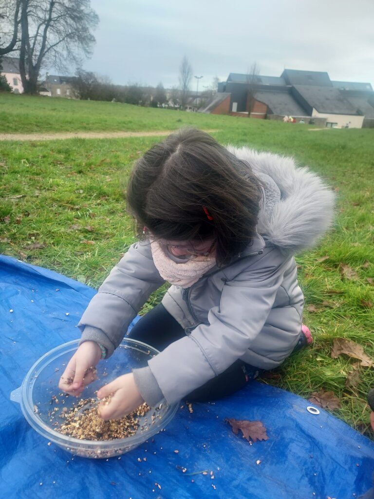 Mardi 20 janvier, nous sommes allés vivre une matinée sur l’ATE (aire terrestre éducative) située au-dessus du Carré d’Art. Nous avons réalisé des parcours avec les éléments de la nature et le matériel de l’école. Avec des petits bâtons, nous avons tracé des quadrillages dans le sable pour décorer la galette des rois, sans oublier d’y mettre une fève ! Puis nous avons fabriqué des boules de graines pour nourrir les oiseaux, nous les avons accrochées dans les buissons, bon appétit les oiseaux ! Enfin, avec des branches, de la mousse et de la ficelle afin d’assembler ces différents éléments, nous avons fabriqué une cabane pour les petits animaux. Nous avons aussi pu jouer dans les arbres !
