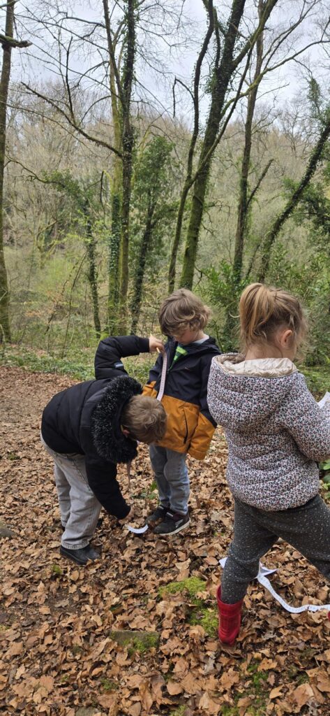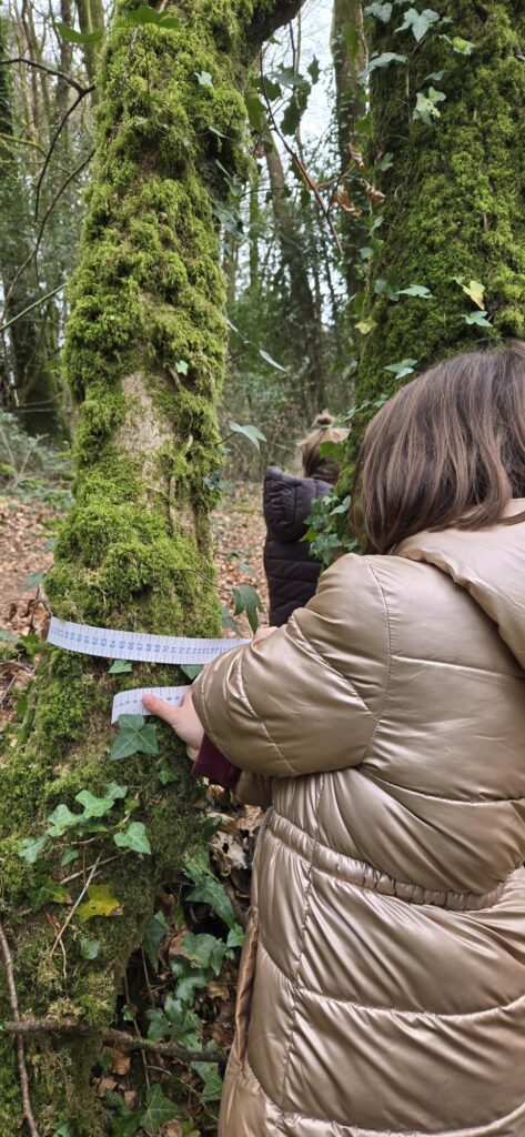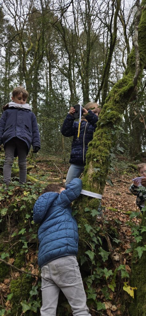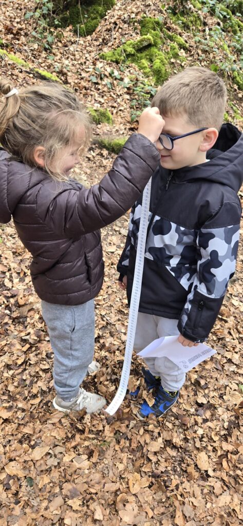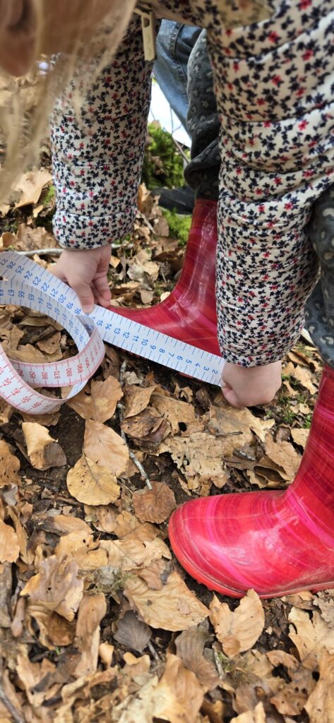 - Apprendre à mesurer en utilisant différents outils de mesure: le mètre, le décamètre, la règle… il fallait mesurer et noter sur un tableau. Ils ont mesurer un tronc d’arbre, les bottes du copain, la longueur d’un arbre… et surtout quel outil utiliser