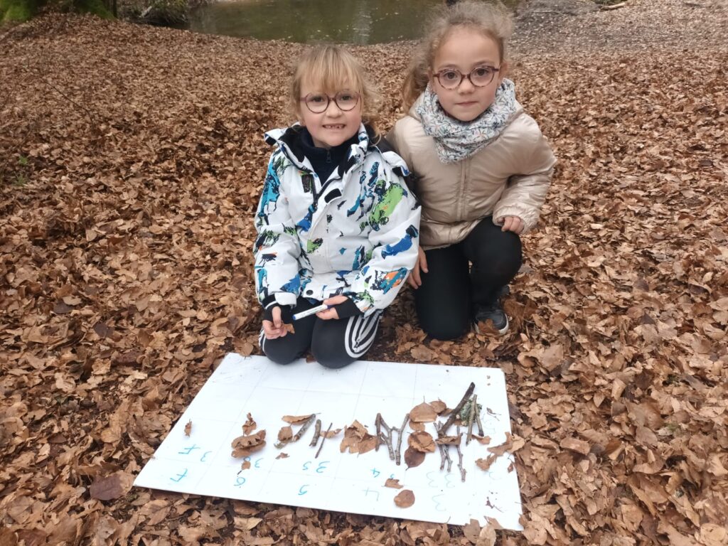 - Math : compléter un tableau à double entrée en faisant des collections de feuilles, de branches, de cailloux… on symbolise la quantité par un élément naturel. Un bâton= 1 dizaine.