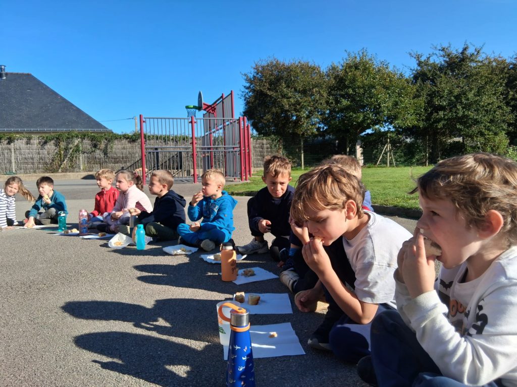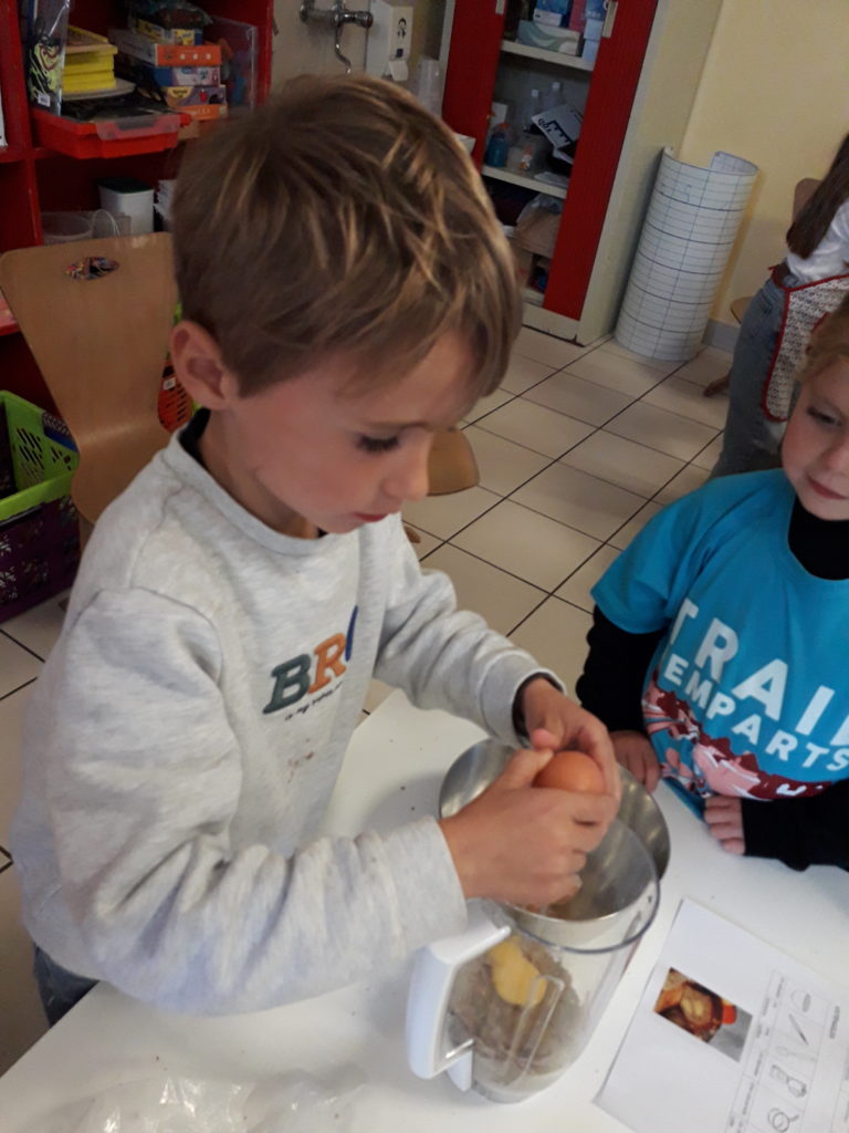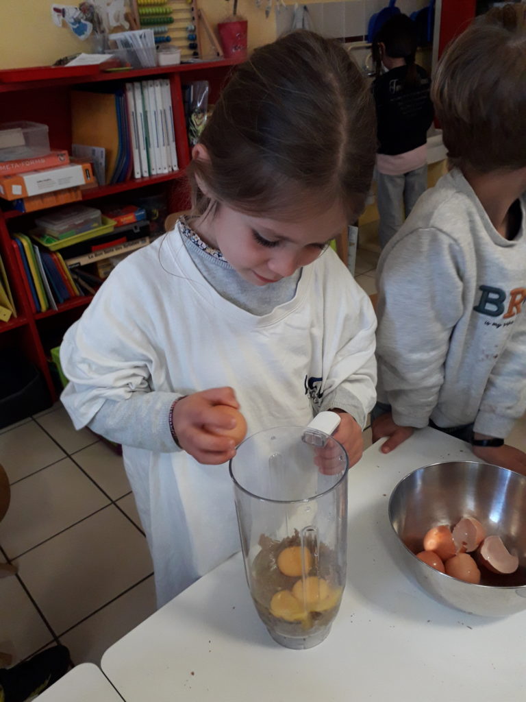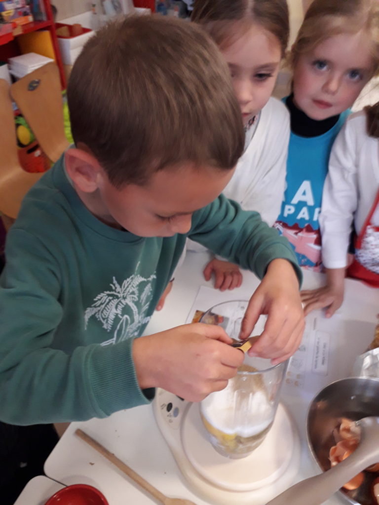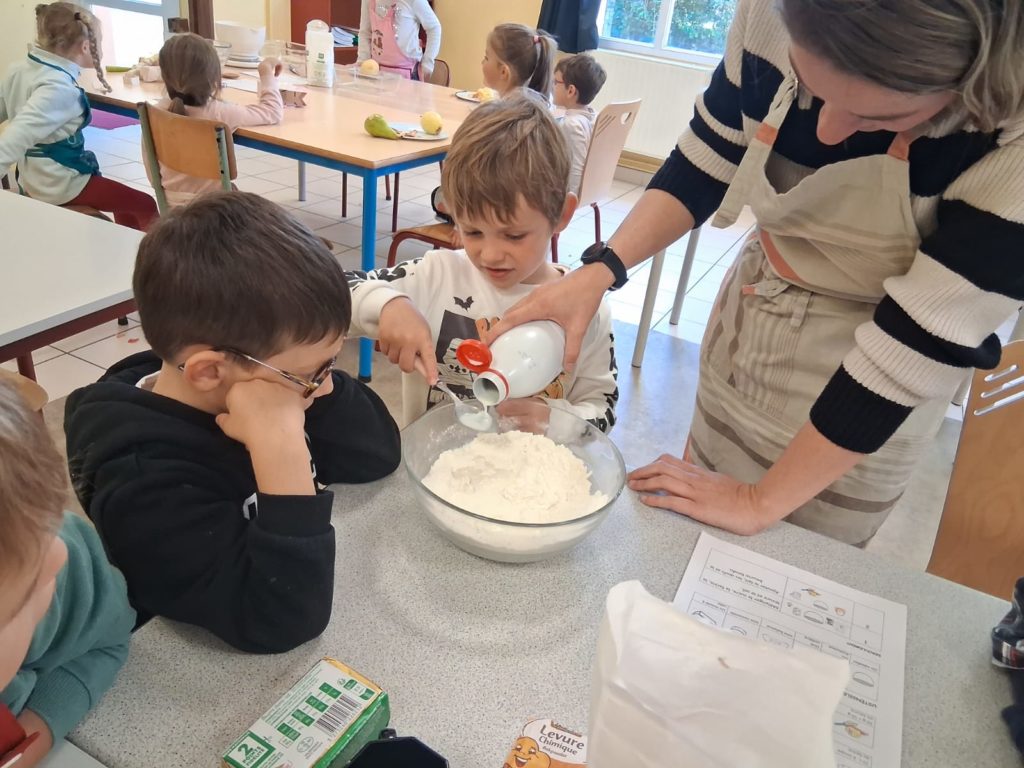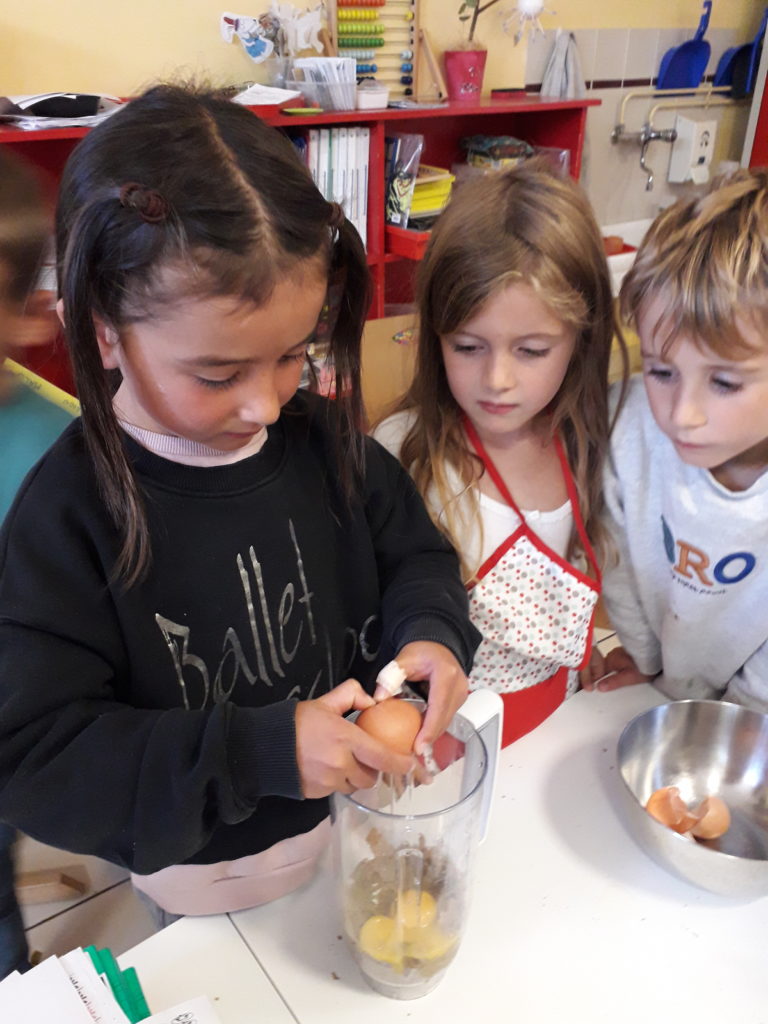 DU 13 AU 17 OCTOBRE, on a eu la chance de découvrir, et de déguster des aliments bretons: le lait, la pomme, la farine de sarrasin et le beurre bien sûr! Les enfants ont utilisé leurs 5 sens et leurs saveurs. Ils ont pris le temps de déguster, goûter en se concentrant sur ce qui se passe dans la bouche. On a découvert aussi qu’avec le lait on fait du beurre, des yaourts et des crèmes. Ils ont fabriqué du beurre avec la crème. Ils ont découvert la farine de sarrasin: elle est marron!! On a revu la pomme provenant du pommier. Avec ces bons ingrédients bretons, le jeudi 16 octobre , ils ont fait les petits cuistots avec leur tablier!! Ils ont réalisé 2 gâteaux: un cake à la pomme et aux galettes de sarrasin, et un far breton au sarrasin.