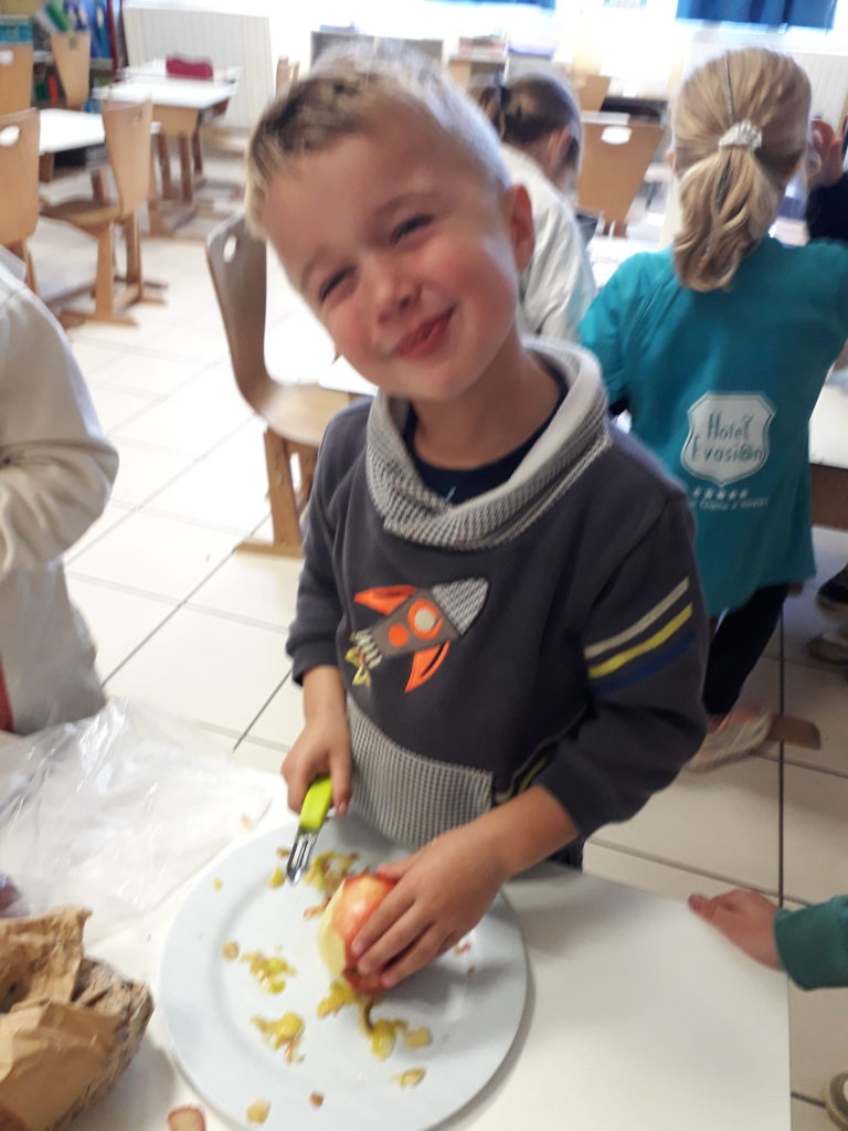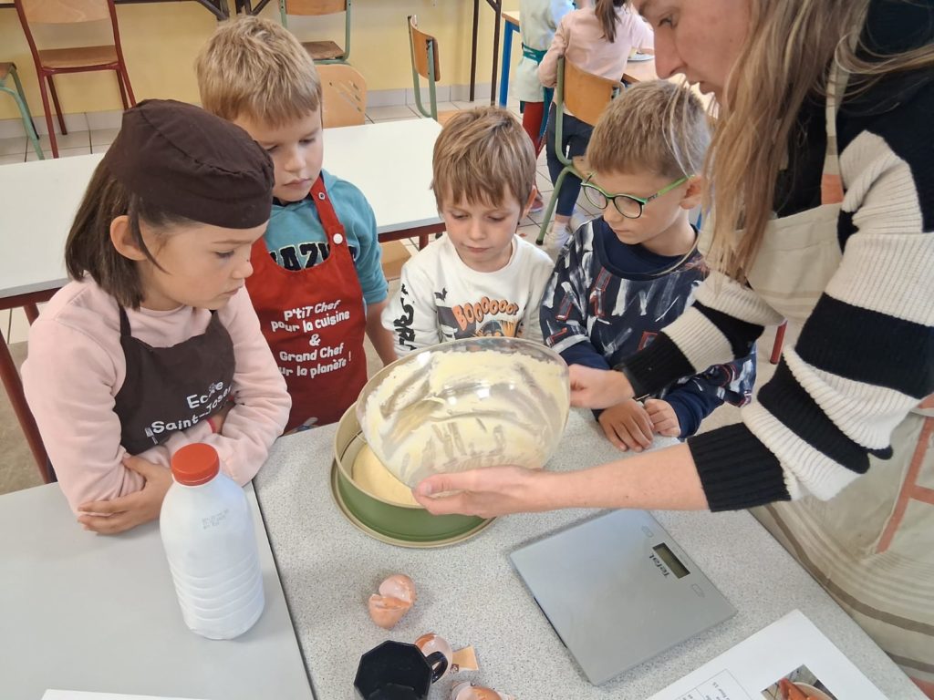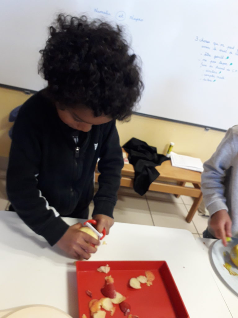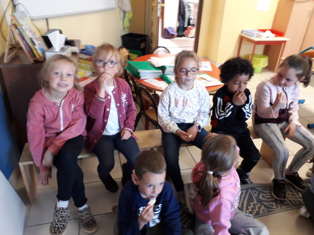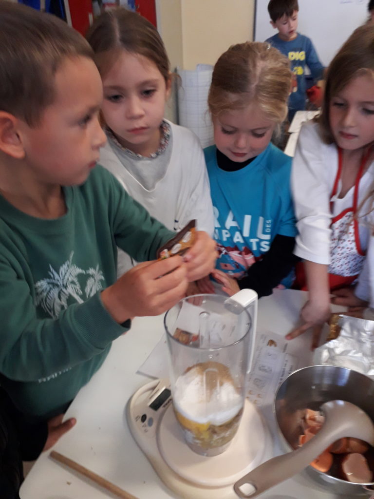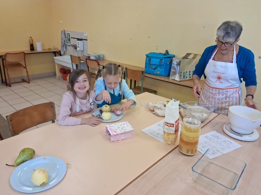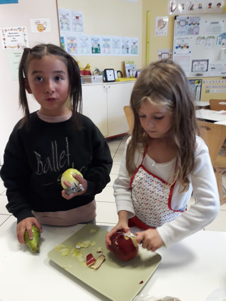 DU 13 AU 17 OCTOBRE, on a eu la chance de découvrir, et de déguster des aliments bretons: le lait, la pomme, la farine de sarrasin et le beurre bien sûr! Les enfants ont utilisé leurs 5 sens et leurs saveurs. Ils ont pris le temps de déguster, goûter en se concentrant sur ce qui se passe dans la bouche. On a découvert aussi qu’avec le lait on fait du beurre, des yaourts et des crèmes. Ils ont fabriqué du beurre avec la crème. Ils ont découvert la farine de sarrasin: elle est marron!! On a revu la pomme provenant du pommier. Avec ces bons ingrédients bretons, le jeudi 16 octobre , ils ont fait les petits cuistots avec leur tablier!! Ils ont réalisé 2 gâteaux: un cake à la pomme et aux galettes de sarrasin, et un far breton au sarrasin.