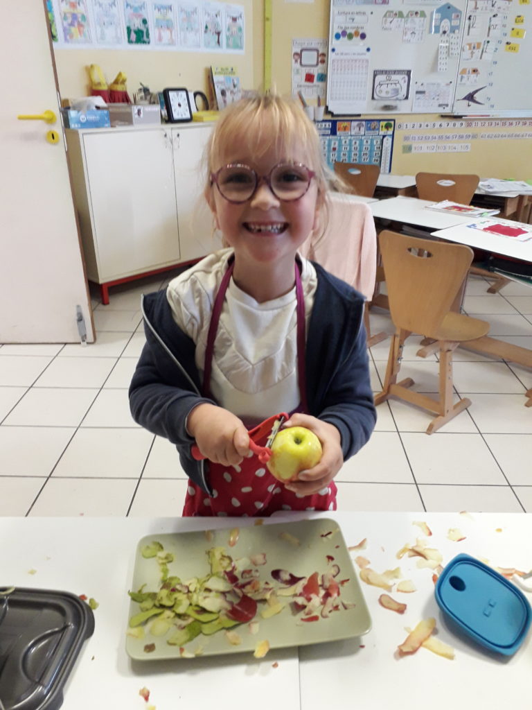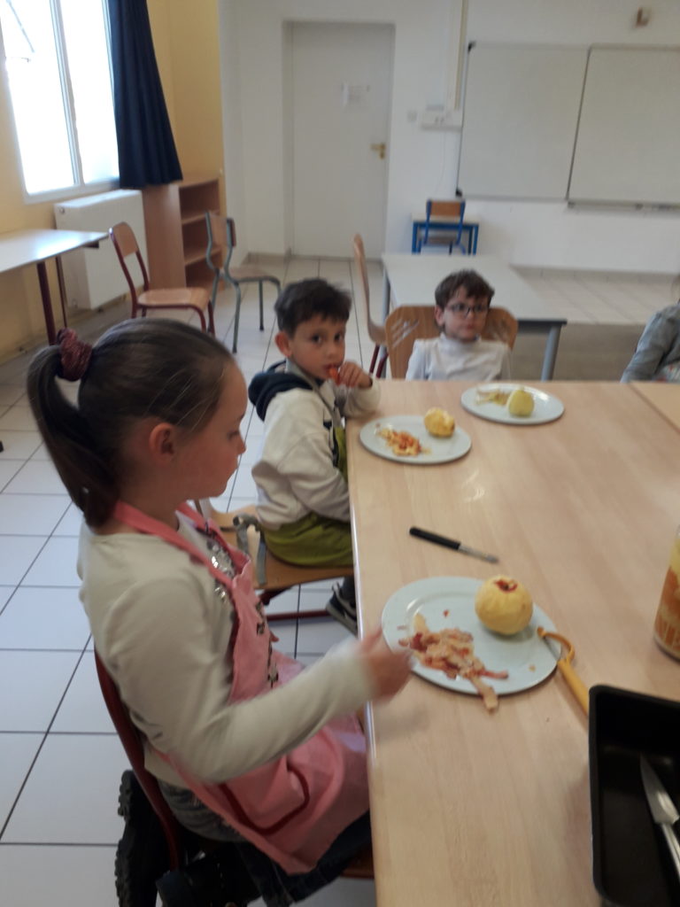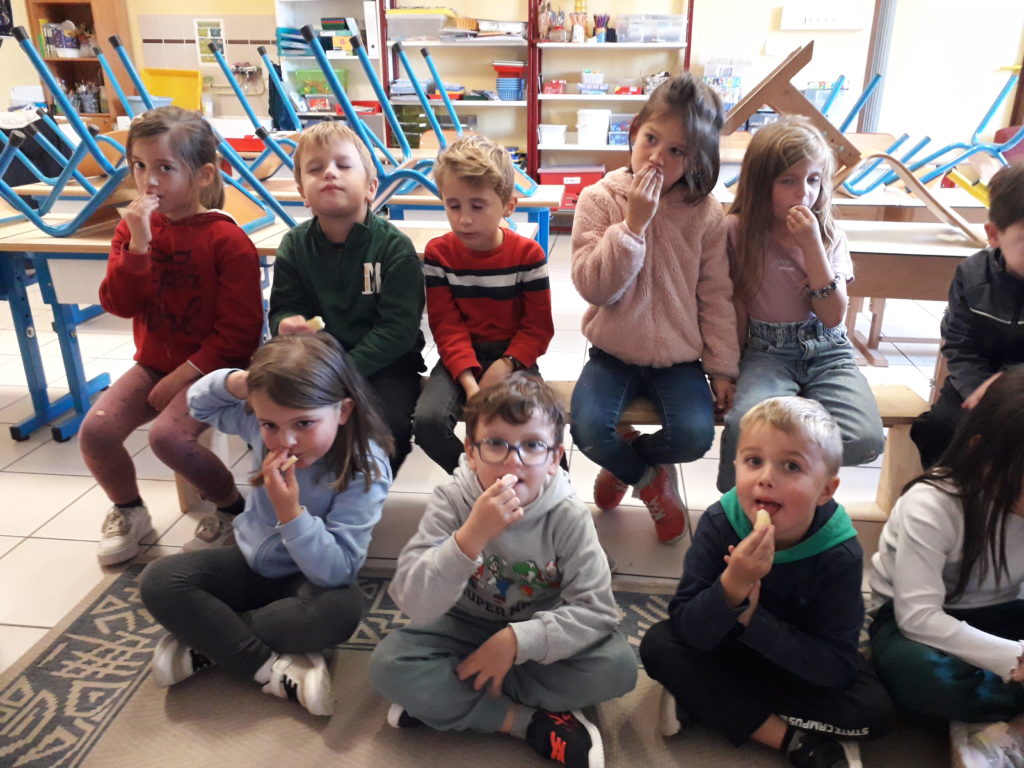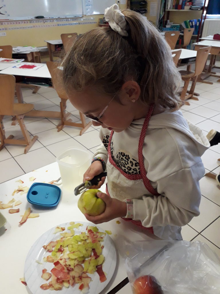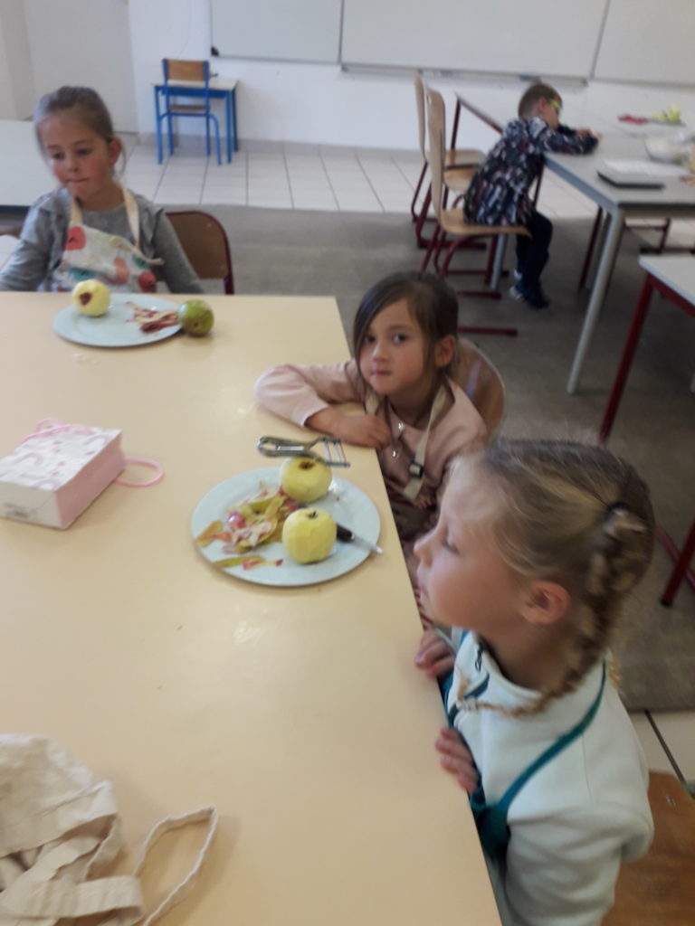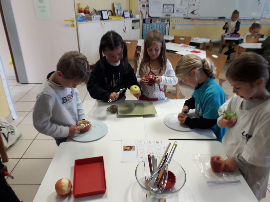 DU 13 AU 17 OCTOBRE, on a eu la chance de découvrir, et de déguster des aliments bretons: le lait, la pomme, la farine de sarrasin et le beurre bien sûr! Les enfants ont utilisé leurs 5 sens et leurs saveurs. Ils ont pris le temps de déguster, goûter en se concentrant sur ce qui se passe dans la bouche. On a découvert aussi qu’avec le lait on fait du beurre, des yaourts et des crèmes. Ils ont fabriqué du beurre avec la crème. Ils ont découvert la farine de sarrasin: elle est marron!! On a revu la pomme provenant du pommier. Avec ces bons ingrédients bretons, le jeudi 16 octobre , ils ont fait les petits cuistots avec leur tablier!! Ils ont réalisé 2 gâteaux: un cake à la pomme et aux galettes de sarrasin, et un far breton au sarrasin.