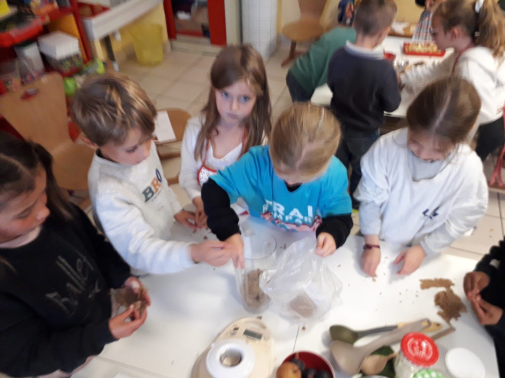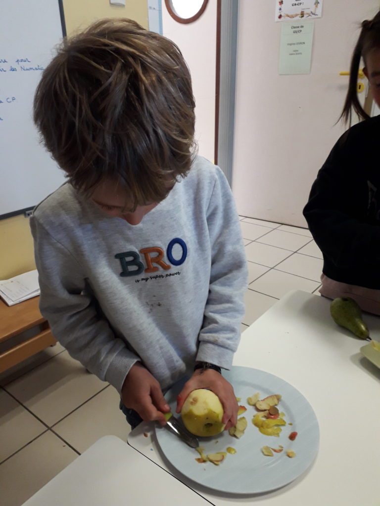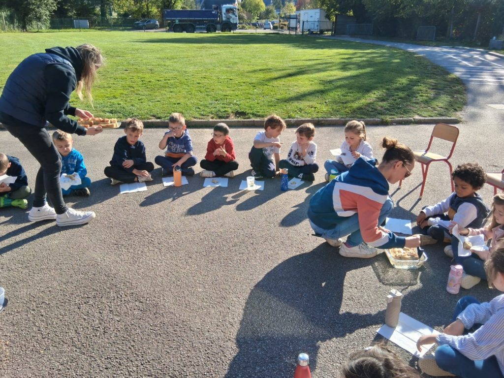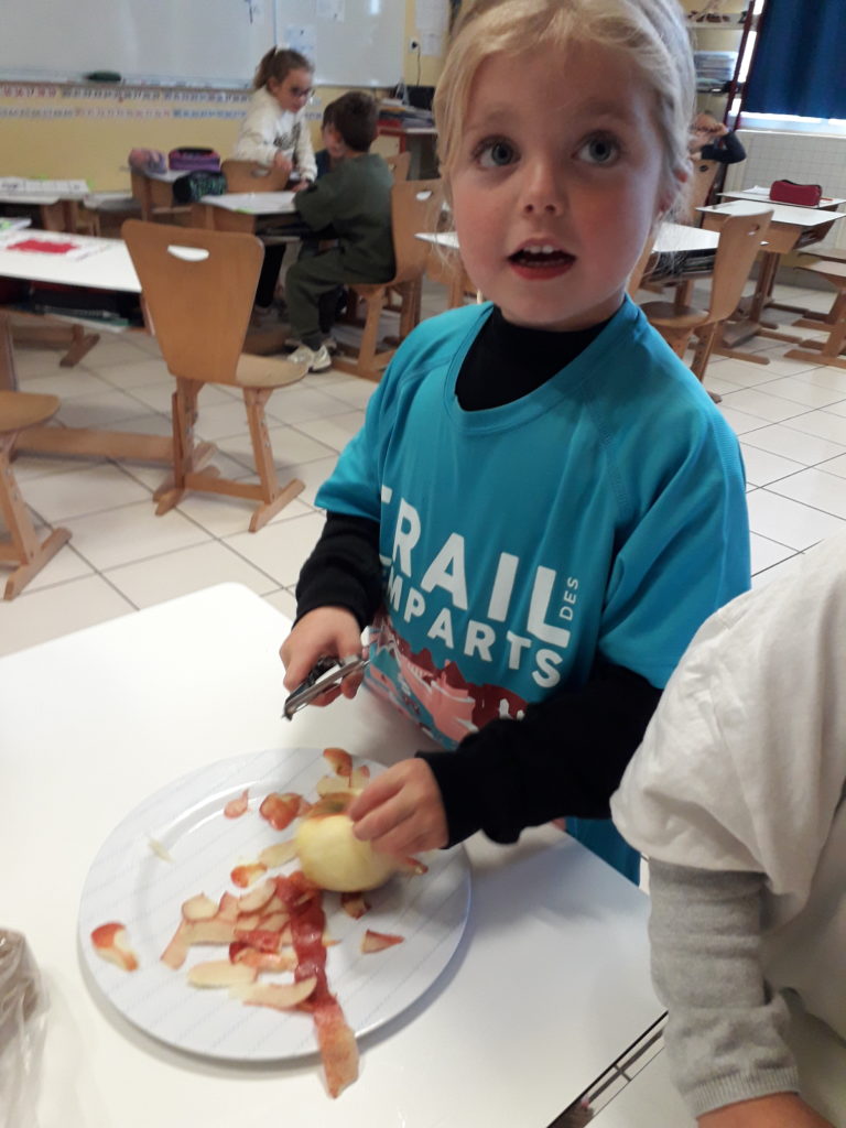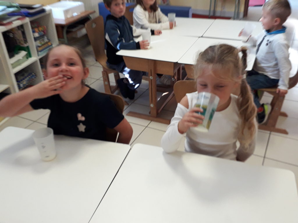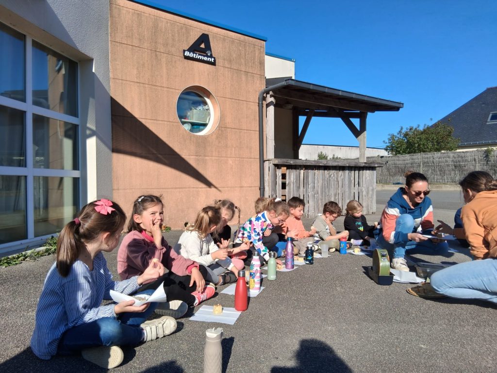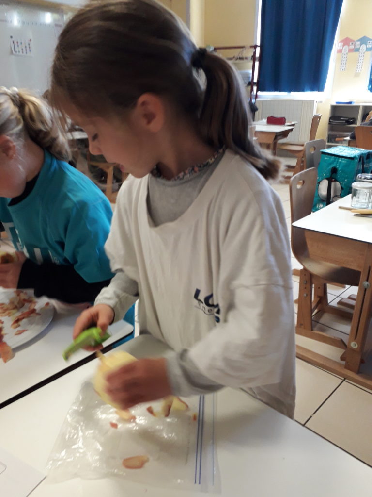 DU 13 AU 17 OCTOBRE, on a eu la chance de découvrir, et de déguster des aliments bretons: le lait, la pomme, la farine de sarrasin et le beurre bien sûr! Les enfants ont utilisé leurs 5 sens et leurs saveurs. Ils ont pris le temps de déguster, goûter en se concentrant sur ce qui se passe dans la bouche. On a découvert aussi qu’avec le lait on fait du beurre, des yaourts et des crèmes. Ils ont fabriqué du beurre avec la crème. Ils ont découvert la farine de sarrasin: elle est marron!! On a revu la pomme provenant du pommier. Avec ces bons ingrédients bretons, le jeudi 16 octobre , ils ont fait les petits cuistots avec leur tablier!! Ils ont réalisé 2 gâteaux: un cake à la pomme et aux galettes de sarrasin, et un far breton au sarrasin.