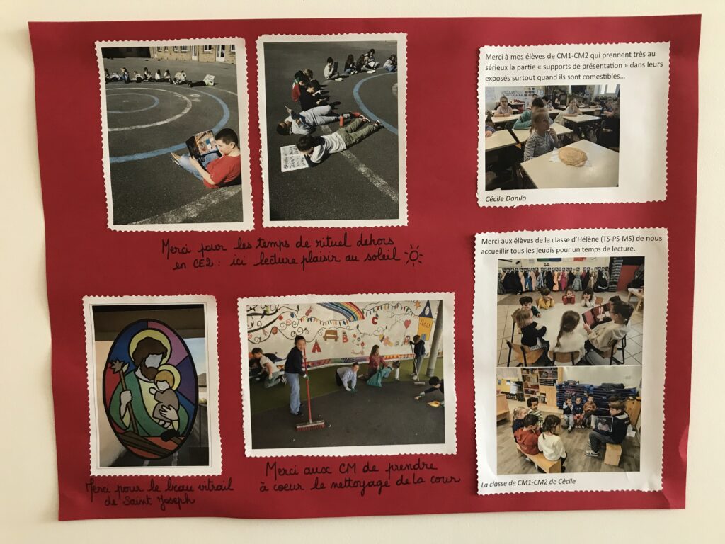 Il est important de dire MERCI pour tout ce que nous vivons ensemble à l’école. Notre « mur des gratitudes » est complété tout au long de l’année scolaire.