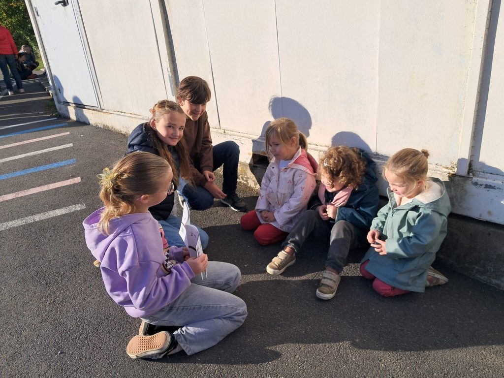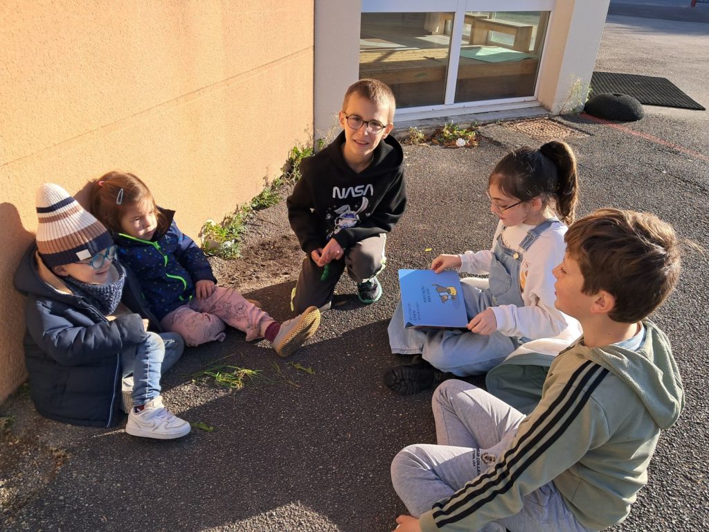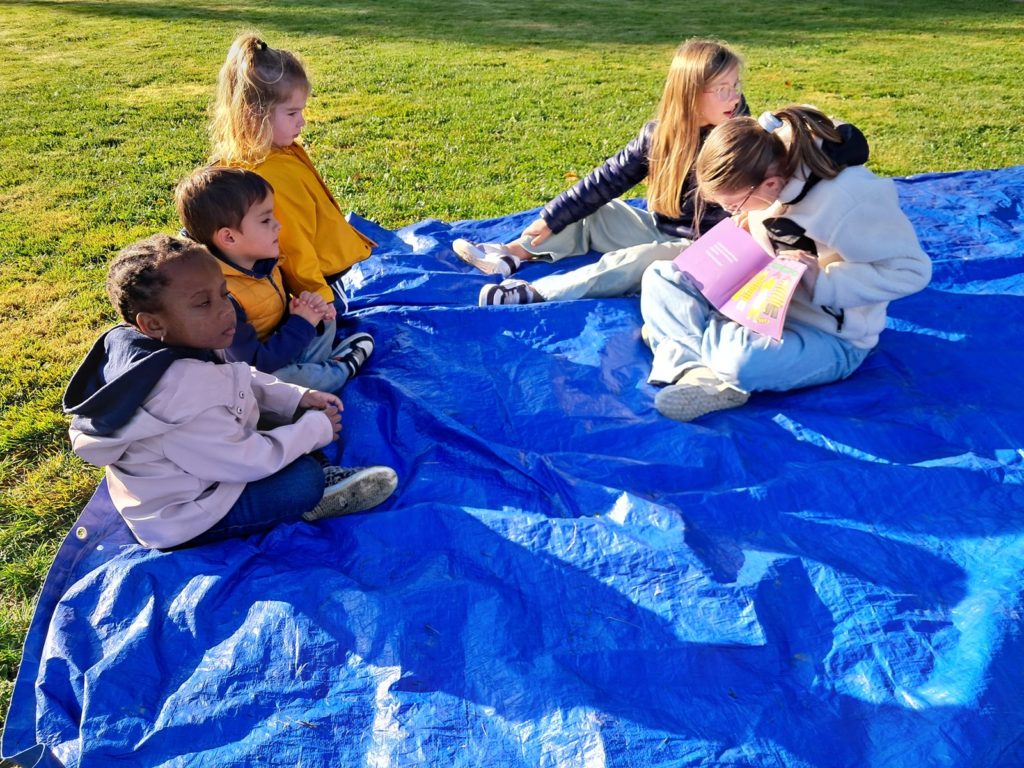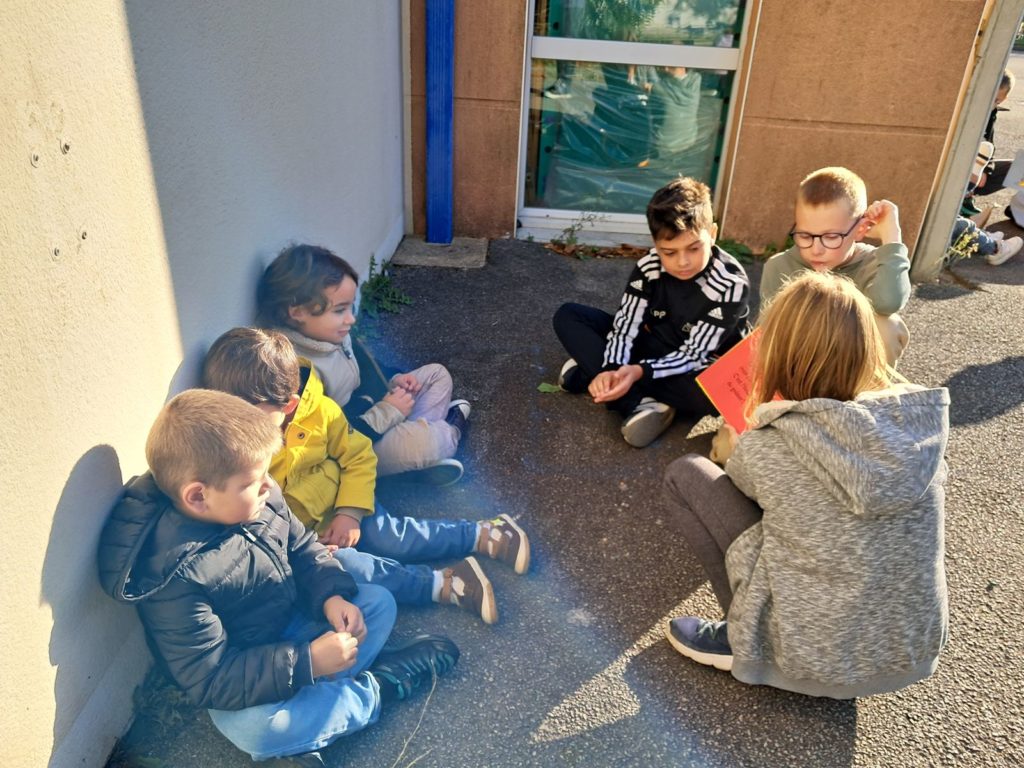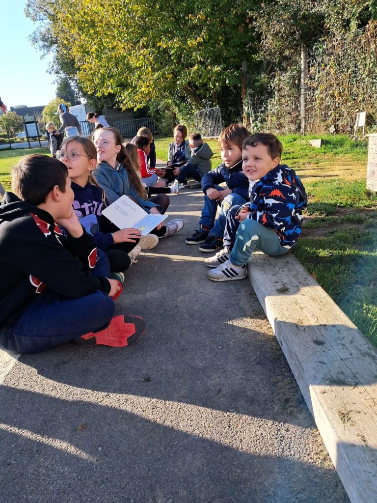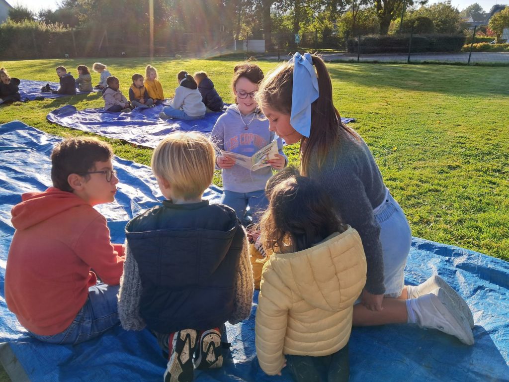 Pour terminer la première période de l’année et profiter du soleil, les élèves des classes de Maud et Gwénaëlle, ainsi que les CM 1 de la classe de Cécile ont rejoint les élèves de la classe d’Annie et Marie-Line dans la prairie de l’école. Les plus grands avaient préparé de belles lectures qu’ils ont offertes aux plus jeunes par petits groupes.