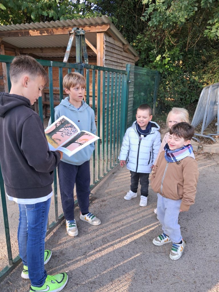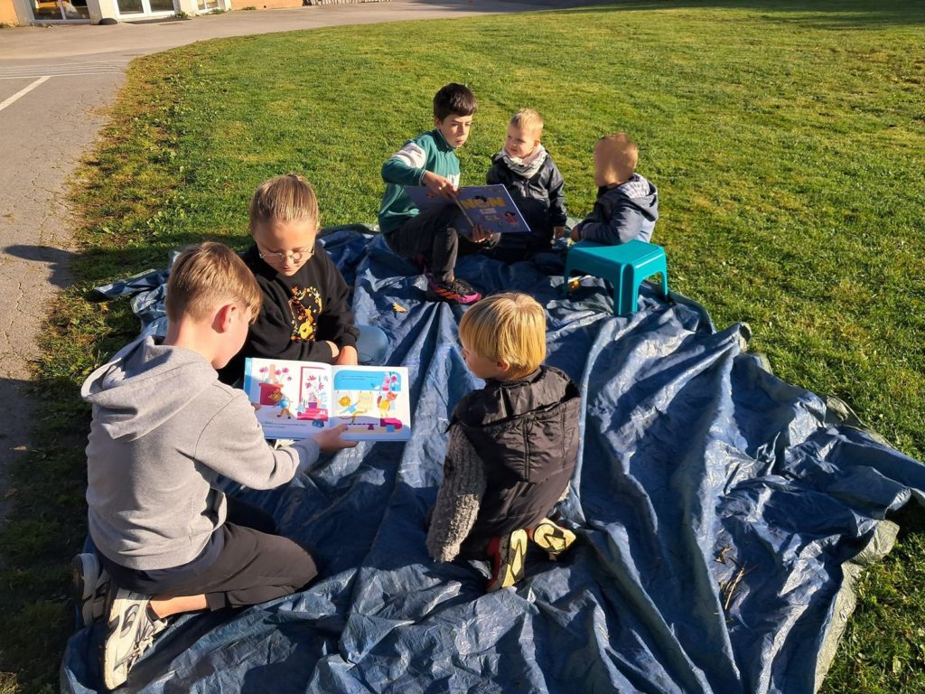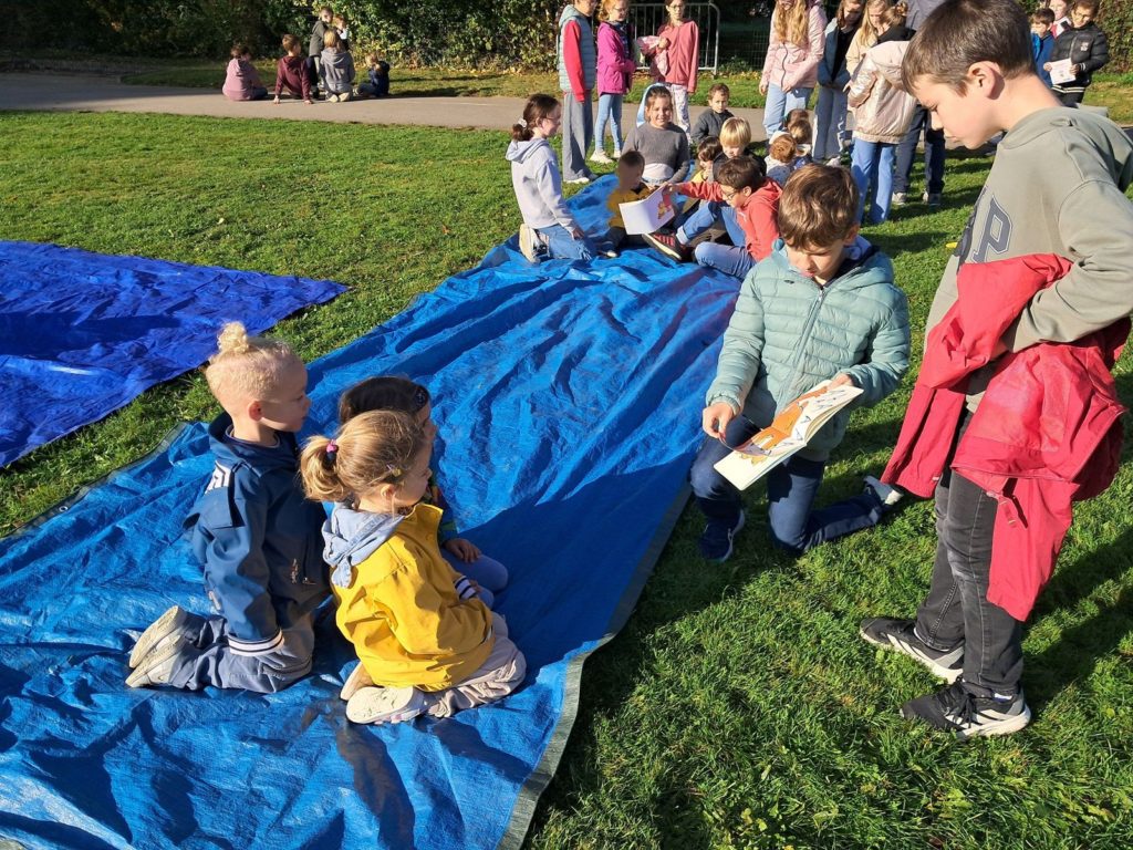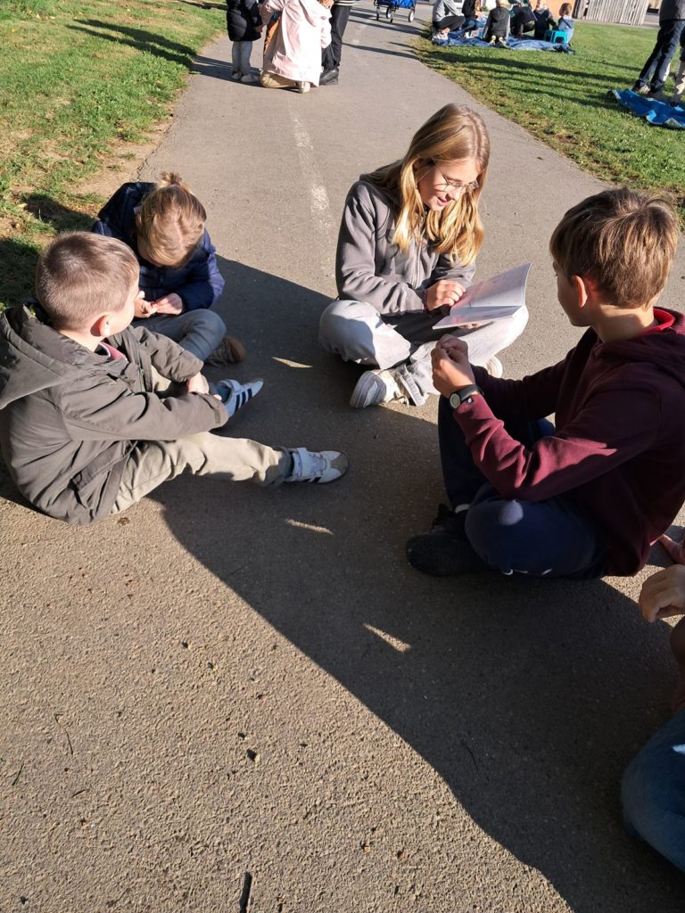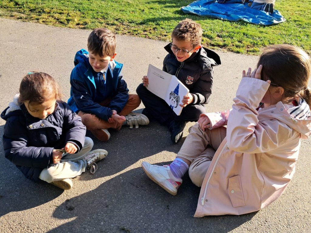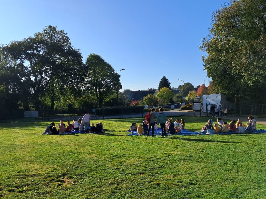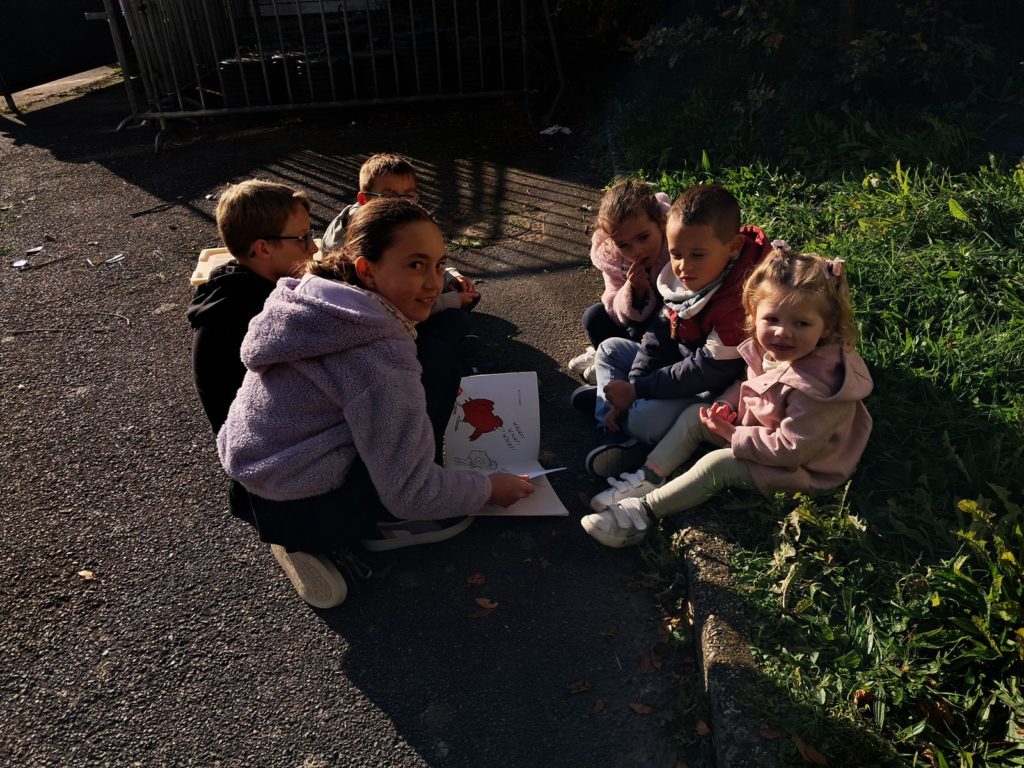 Pour terminer la première période de l’année et profiter du soleil, les élèves des classes de Maud et Gwénaëlle, ainsi que les CM 1 de la classe de Cécile ont rejoint les élèves de la classe d’Annie et Marie-Line dans la prairie de l’école. Les plus grands avaient préparé de belles lectures qu’ils ont offertes aux plus jeunes par petits groupes.